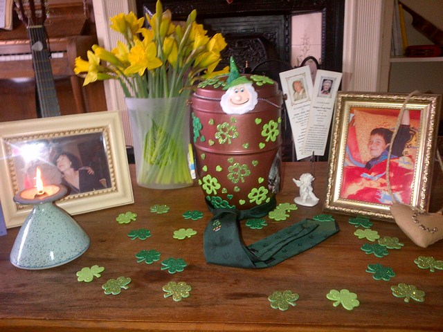 - My Son’s Urn decorated for this Special Weekend. Eighteen today, Irish Rugby Team Play France for The Championship and St. Patrick’s Day is on Monday. The Tie belongs to my late father. A gift from me many years ago. It commemorates Ireland winning the Triple Crown (Rugby) in 19982