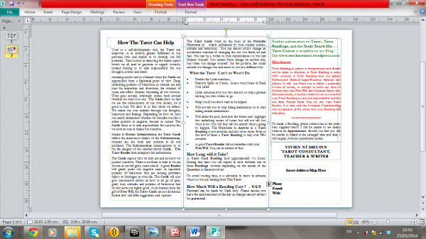 As it is not possible for me to upload the actual Tarot Brochure itself via WordPress, I have taken a Screenshot of the Front and Back of the Brochure which is then folded in Three. This Brochure was created using Microsoft Office Publisher but there are several On-Line Companies offering Brochure Creating Facilities. Below the Screen-Shots I have supplied the Brochure Text. This should give you an idea of what you might like to put in your Brochure. If you would like to base your Brochure on mine that is fine and all you will have to do is change Name, Contact Details and Photograph etc. Obviously you will need to write your own Personal Bio to let people know about you. I have a lot of content in my Brochure as I am A Tarot Consultant which you may not feel is necessary, so you can adapt it to suit your needs.