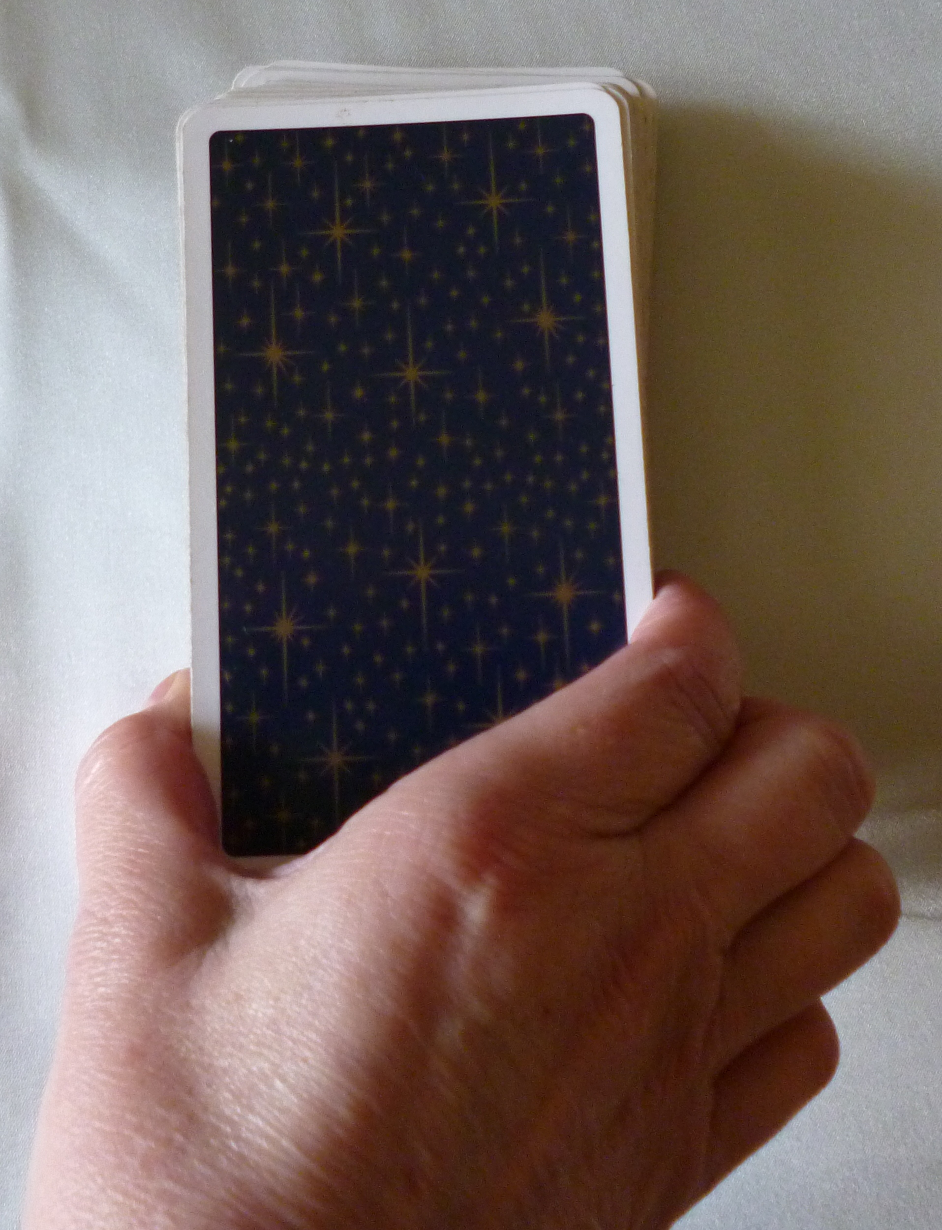 Handing the Cleared and fully Upright Deck to The Querant prior to Shuffling. Before The Querant starts Shuffling check to make sure all Cards are Upright.