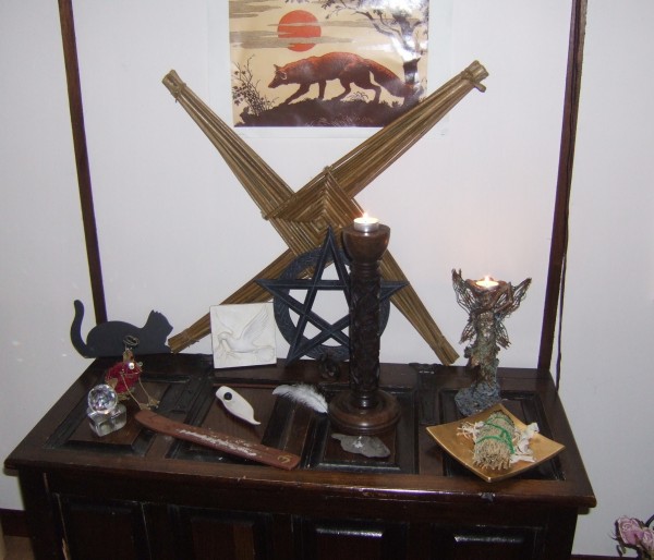 Table Set for Reading. Silver Satin Table Cloth, Chalice, Pentacle, Small Sword, Wand, Pendulum, Paper and Pen for Numerology, Oil Burning Lamp, Crystals, Selection of Non-Tarot Cards, Pitcher of water, Two Glasses, Tissues beside Client Seat, Comfortable Seat for Client, Extra Radiator in the background in case Client gets Cold.
