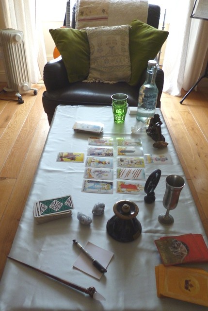 - A nice velvet, silk or satin cloth on the table is very appropriate. Make sure it is not covered in pattern as then the imagery on the Cards has to compete with other non-relevant detail which can be very distracting. Now you can add some items that hold special meaning for you or that help you focus, such as Crystals,Feathers or Bells. I typically have a small Upright Pentacle, a Wooden Wand with a Rose Quartz Point, a small Chalice/Cup and a miniature decorative Sword. These I use to represent the Four Suits. Candles are always a welcome addition but be careful about burning incense as some people are allergic to it and it can be harmful to pregnant women.