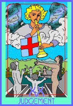 The figures depicted in the Judgement Card stand naked, again reminding us that when Judgement Day arrives we will no longer be able to hide behind a facade, lies or pretence. All our deeds, both good and bad will be exposed and laid bare before the Higher Powers and our Higher Self. Nothing can be hidden on Judgement Day.