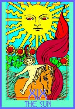 The Sun is where we arrive at after finding our way through the dark with only The Moon to light the path. By facing our fears, calling on our inner-strength and having faith that life would deliver us to a better place we have eventually arrived at The Sun.  After the darkness of The Moon, The Sun has eventually risen (it always does).  With the dazzling glow and warmth of The Sun engulfing us, we now find that those things we feared so much in the pale vapoury light of The Moon are actually quite harmless or not as bad as we thought they were going to be.  Everything looks better in the clear light of day.  When The Sun shines it is quite easy to forget our woes and the world can suddenly look like a good place to be. The Sun generally has a wonderful effect on us.  People are friendlier to each other and come out of their normal seclusion to enjoy the beauty of a sunny day.  The Sun warms the chill out of our bones and out of our minds. The Sun brings happiness. The Sun, also brings success, achievement and celebration.
