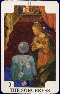 The High Priestess covers a broad spectrum of sex associations due to her triple goddess aspect, especially maiden and crone. She can behave as the Maiden, Mother–in-Waiting or Crone in varying levels of sexual interest and activity. As Maiden she can still retain her virginity, has already experimented with sex or is happily sexually active, but definitely not married and generally (but not always) childless. Virgin may only imply she has not yet fully committed or married. She could also be the single mother. As Mother-in-planning, her sex life takes on a new meaning as she seeks more than enjoyment from the act of sex. As mother-in-waiting, her egg has just been fertilised, the seed sown by the Magician. As yet, she cannot quite embody the status of The Empress until the baby is fully born. She still retains her maiden appearance, yet to learn the skills of motherhood. She is in transition. If a baby is desired, this will change her sex life for the foreseeable future. The Mother stage typically puts her with a consistent or regular sex partner, unlike the Maiden who may have several, or a series of short to medium length relationships. As Mother, she will transition to the Empress, her sexual role very much tied up with procreation and never is she more beautiful and sexy. Appearing in her Crone aspect, her interest in sex is either rekindled, born out of a new-found freedom that often occurs after separation, divorce or menopause, or has sadly diminished with the approaching years.